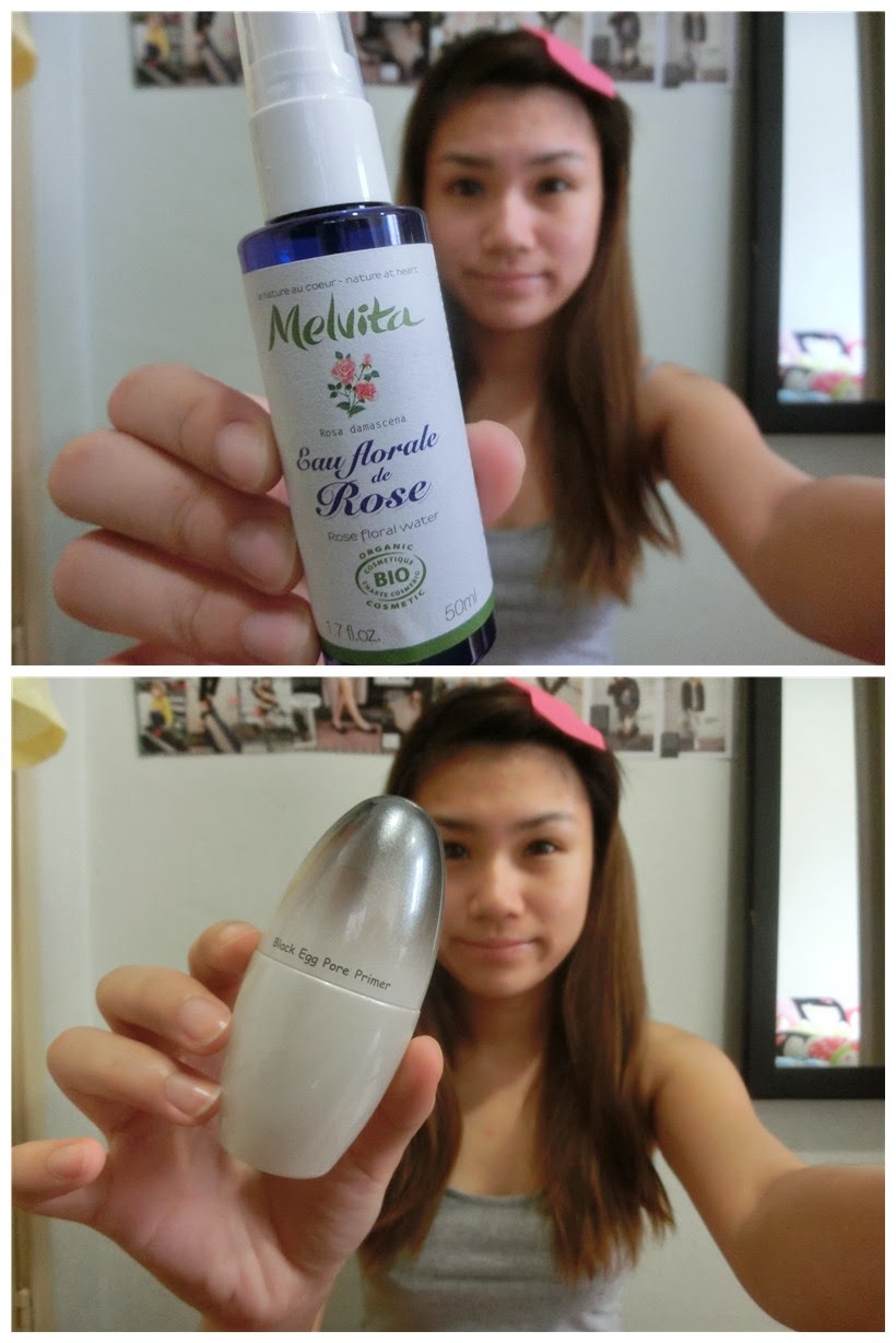 Rose water from Melvita before applying anything to my face. Follow by the primer. Using primer can reduce the harm of cosmetic toward our skin and also makeup could stay on our face for a longer time.